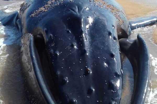 Baleia jubarte viva encalha em praia de Linhares, no Norte do ES