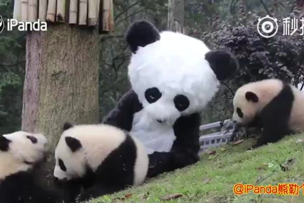 Melhor trabalho do mundo? Tratador se fantasia de panda para virar ‘babá’ de filhotes