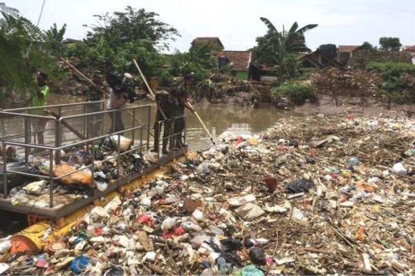 Terceira maior cidade da Indonésia convocou militares para ajudar a resolver problema de rio inundado por lixo plástico. Rio é totalmente encoberto por ‘montanha’ de lixo…