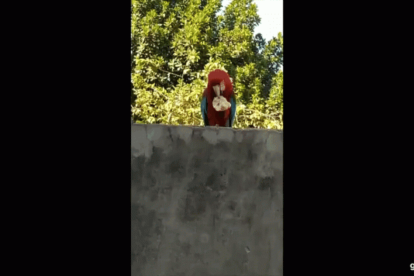 Ave aparece todos os dias pela manhã e é alimentada com frutas pela moradora. Arara se alimenta em muro de casa Rosilene Nascimento/Arquivo pessoal Uma arara vermelha, apelidada…