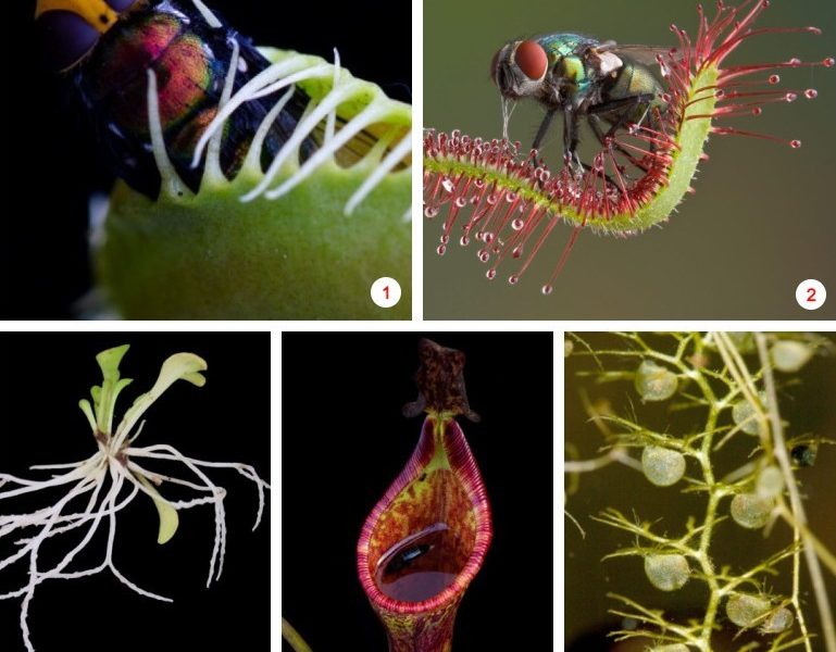 Vegetais podem atrair presas simulando um orvalho ou abrigo. Brasil tem o maior número de espécies criticamente ameaçadas do mundo por causa da conversão de terras para a agricultura, diz estudo de especialista. (1) Dionaea – armadilha: jaula; (2) Drosera – armadilha adesiva; (3) Genlisea (subaquática ou subterrânea) – armadilha