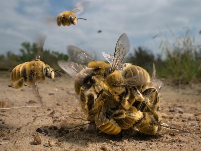 Abelhas se embolam em uma tentativa de acasalar, na foto vencedora da edição 2022 do concurso internacional de fotografia de vida selvagem Karine Aigner/World Photographer of the Year/Divulgação Uma fotografia que mostra o momento em que diversos zangões se embolam em torno de uma abelha fêmea para tentar acasalar foi