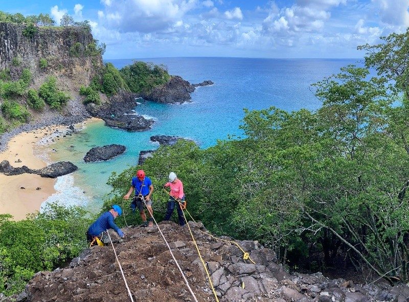Praia foi fechada em 25 de junho. Nesta quarta (6), o Instituto Chico Mendes da Biodiversidade informou que a área segue fechada até meados de agosto. ICMBio realiza manutenção nas encostas Ion David/Divulgação ICMBio A Baía dos Porcos, uma das praias mais visitadas do Parque Nacional Marinho de Fernando de