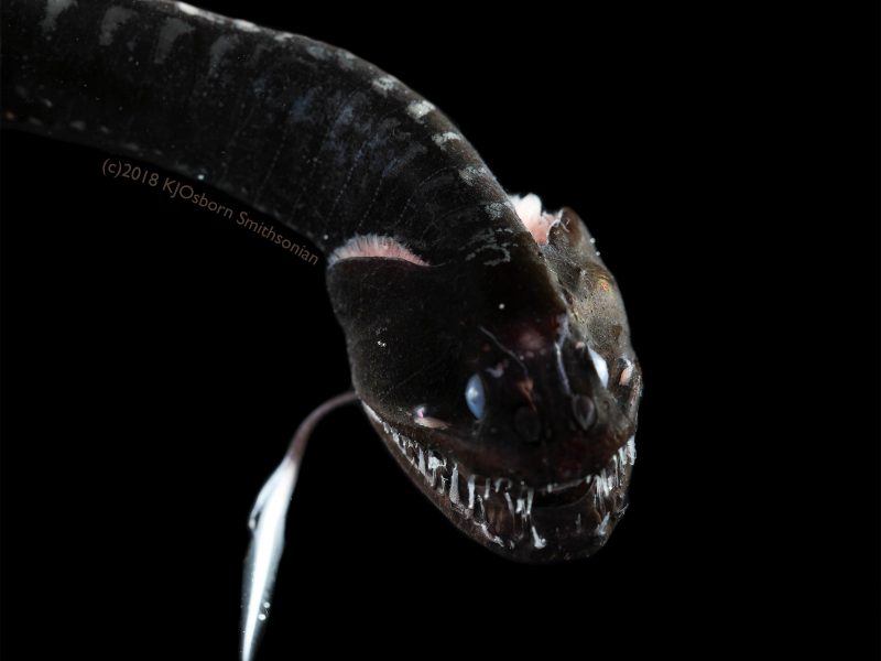A pele desses peixes está entre os materiais mais escuros conhecidos e serve para camuflá-los bem onde a luz quase não entra. Dragão preto do pacífico, um dos peixes ‘ultra-pretos’ que tiveram a pele estudada em pesquisa nos EUA Karen Osborn/Smithsonian/Handout via REUTERS Para peixes que habitam a imensa escuridão