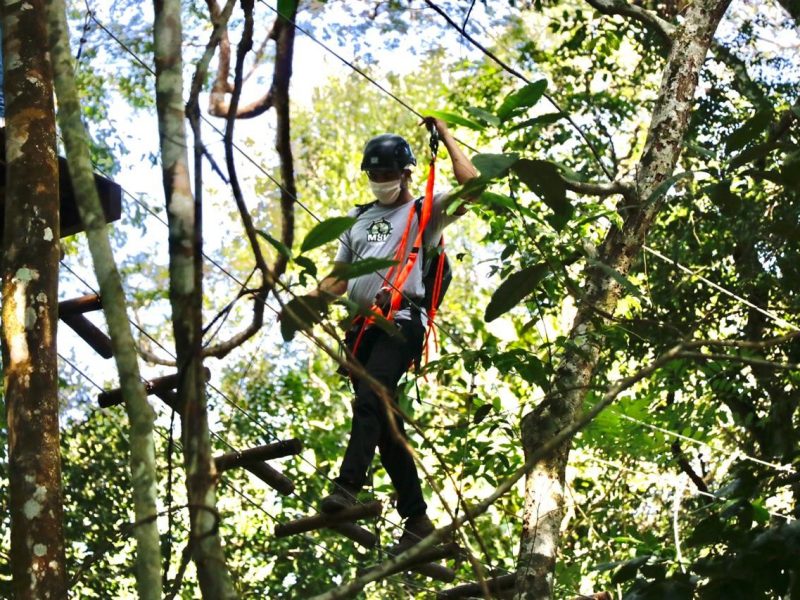 Circuito de aventura que já tinha a tirolesa agora recebe a parede de escalada, trilha suspensa, e ainda a canoagem, arvorismo e camping. Trilha suspensa passa pelas copas das árvores e mostra o Bioparque da Amazônia por outro ângulo Gabriel Flores/PMM/Divulgação Ainda sem previsão para reabertura devido à pandemia do