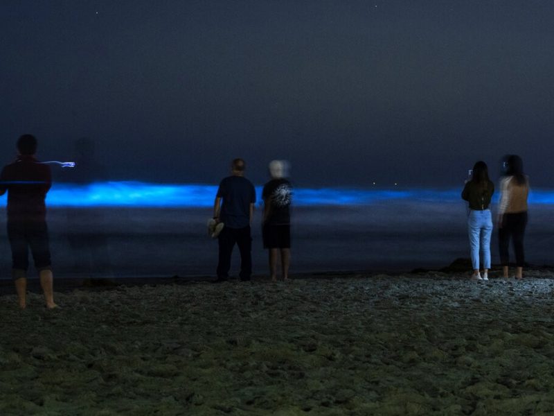 Fenômeno conhecido como “maré vermelha”, é resultado da bioluminescência das algas do Pacífico; praias da região estão fechadas para conter o avanço do novo coronavírus. Pessoas observam as ondas azul-brilhantes em praia da Califórnia enquanto tentam manter uma distância segura em praia que está fechada por conta de medidas de