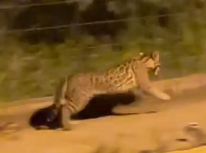 Jaguatirica é encurralada ao tentar entrar em área protegida por tela em MT; veja vídeo