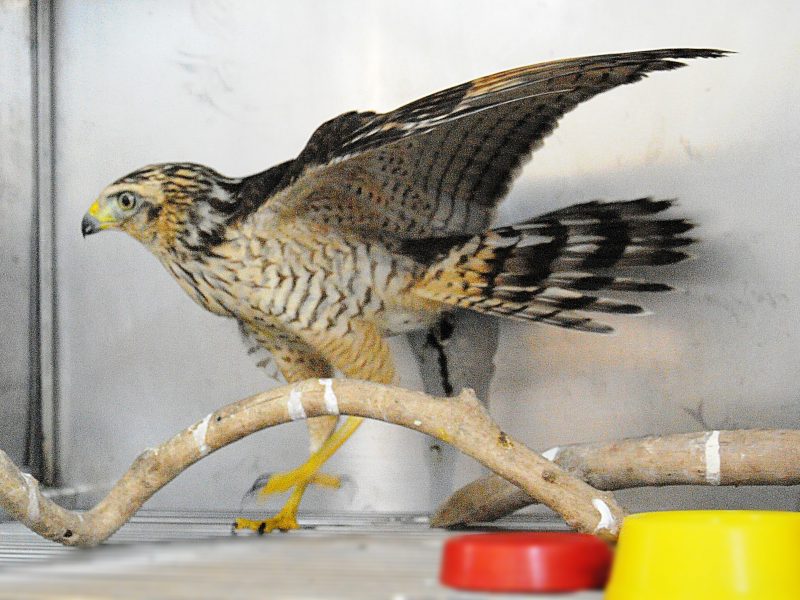 Quando foi resgatado, ave já estava com perda de peso e parte do ferimento havia necrosado. Natural da fauna brasileira, o gavião-carijó é uma ave de rapina de bico forte e garras afiadas, inserida em seu nicho com o papel de regular a população de roedores e aves pequenas. Gavião-carijó