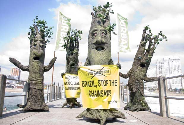 Ativistas do Greenpeace, vestidos de árvores, protestam contra o desmatamento da Amazônia no Brasil Arquivo/John Robinson/Greenpeace/AP O relatório Forest 500, divulgado esta semana pela organização Global Canopy, especializada em fornecer dados e orientações para empresas, investidores e governos que já estão adotando ações positivas em relação ao meio ambiente, mostra