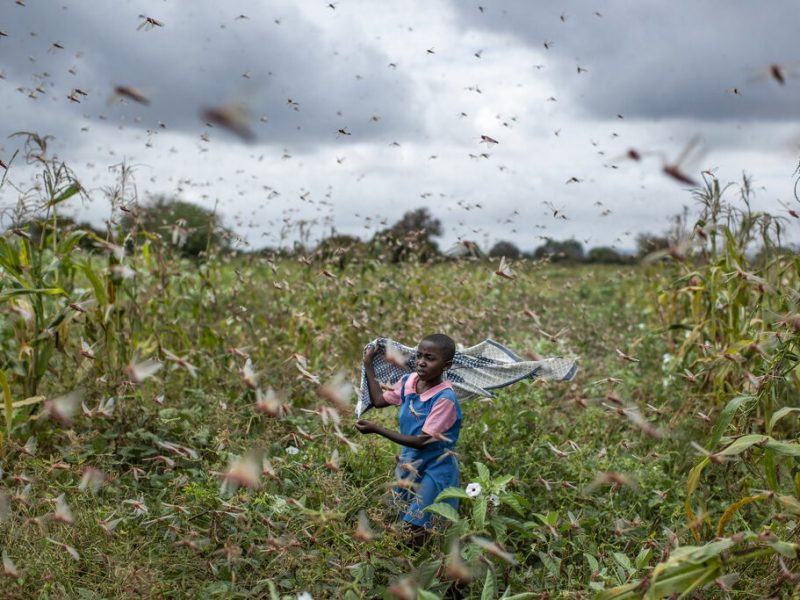 A filha de um fazendeiro tenta afastar um enxames de gafanhotos de sua plantação na aldeia de Katitika, no Quênia Ben Curtis/AP Centro do Quênia, na África, país de baixo Índice de Desenvolvimento Humano, meados de janeiro. O pequeno produtor Lawrence Mwagire acorda e vê, ao longe, uma nuvem muito