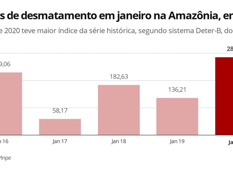 Sistema do governo federal aponta que permanece tendência de aumento no desmate. Análise do trimestre (novembro, dezembro e janeiro) também indica recorde na série histórica, que começou em 2016. O total de áreas sob alerta de desmatamento na Amazônia bateu recorde em janeiro de 2020. De acordo com os dados