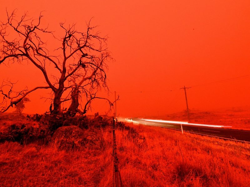 Ao menos 8 milhões de hectares foram atingidos pelos incêndios no começo do ano e mais de 30 mortes foram confirmadas. 4 de janeiro – Foto de longa exposição mostra um carro passando por uma estrada com o céu fica vermelho de fumaça do incêndio nos arredores de Cooma, na