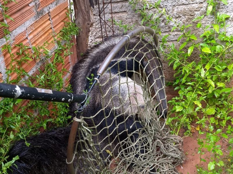 Tamanduá-bandeira é resgatado pela Polícia Ambiental de quintal de residência em Presidente Bernardes; veja VÍDEO