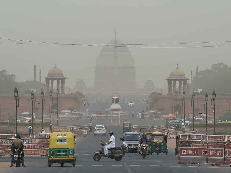 Organização Mundial da Saúde (OMS) prevê piora nos casos de câncer de pulmão, infartos e problemas respiratórios caso não haja redução nas emissões de carbono; deve subir o número de casos de doenças tropicais com aumento das temperaturas. Veículos são vistos em meio à poeira na paisagem de Nova Deli,