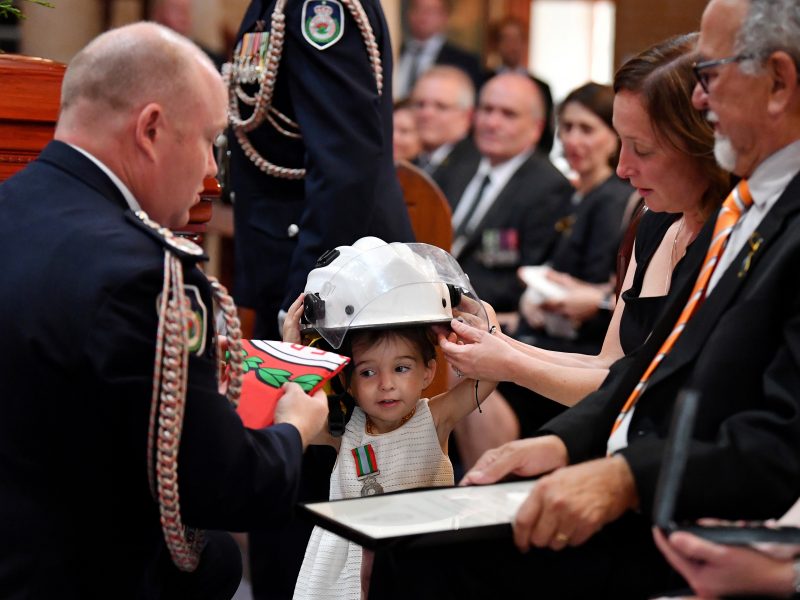 Charlotte O’Dwyer vestiu o capacete de seu pai, Andrew, morto durante ação de combate às chamas; ao todo três bombeiros morreram desde o início dos incêndios em setembro. Charlotte O’Dwyer, filha do bombeiro Andrew O’Dwyer, recebe o capacete de seu pai durante velório. AAP Image/Dean Lewins/Pool/Reuters Bombeiros australianos formaram uma