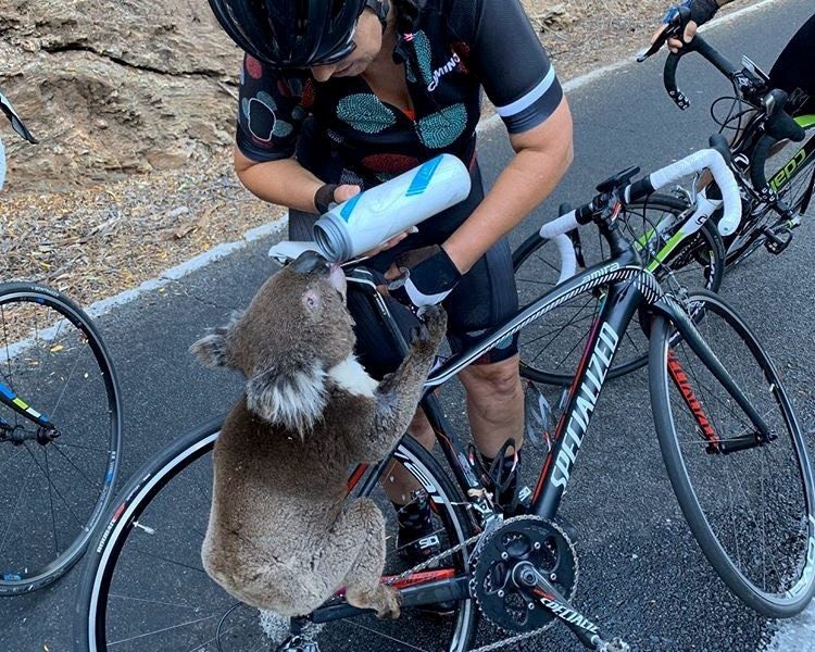 Coala bebe água de ciclista durante onda de calor na Austrália