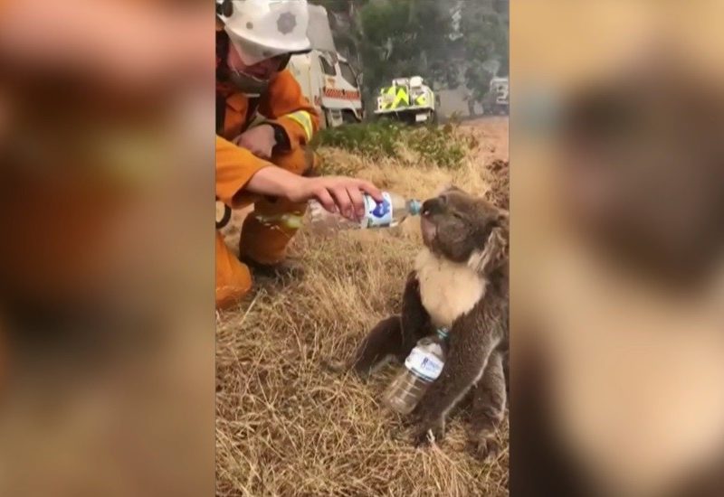 Bombeiros dão água para coala resgatado de incêndios na Austrália