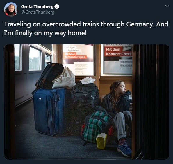 Foto postada pela ativista sueca durante a volta para casa alimenta onda de críticas aos serviços da ferroviária alemã. Deutsche Bahn reage, afirmando que em parte da viagem jovem tinha assento na primeira classe. Greta Thunberg publica foto em viagem de trem no Twitter Reprodução/Twitter/GretaThunberg A ativista do clima Greta