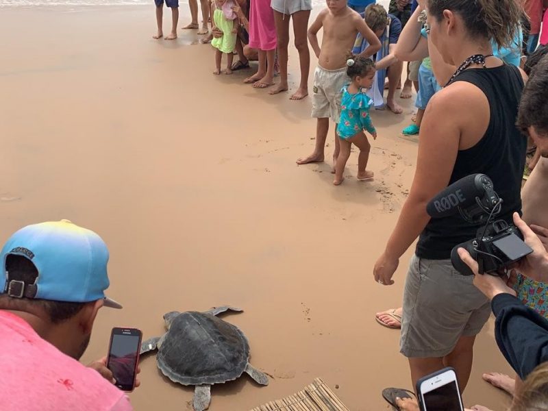 Após um mês e meio, tartaruga encontrada coberta de óleo em praia do sul da Bahia é devolvida ao mar