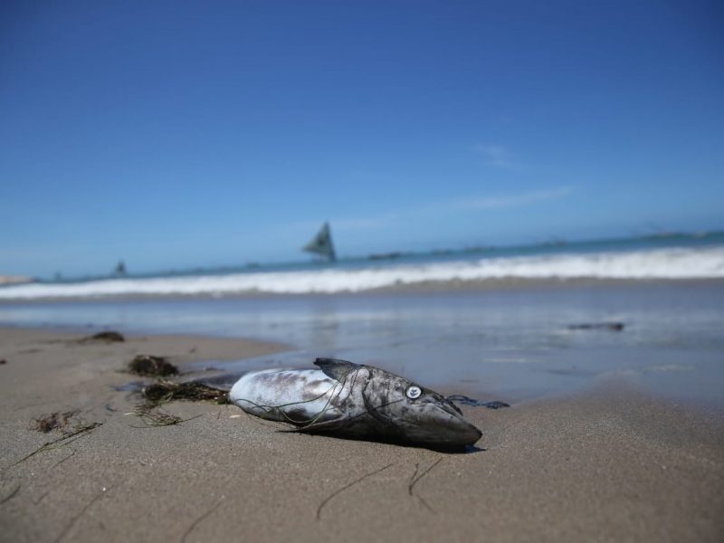 Outras 66 estão dentro dos parâmetros. Ministério da Agricultura diz que não é preciso suspender venda porque risco só existe em caso de consumo contínuo durante vários anos. Peixe encontrado morto na praia de Icapuí, no Ceará; amostras de pescado de 5 estados estão sendo analisadas para avaliar se houve