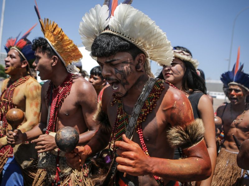 Decisão saiu depois de integrantes da tribo Tupinambá de Olivença protestarem contra a construção. Grupo alega que projeto foi aprovado pela Embratur. Indígenas protestam na Esplanada dos Ministérios, em Brasília. Líderes de 26 tribos das etinias Pataxó e Tupinambá estão em Brasília pela regularização de territórios e por uma série