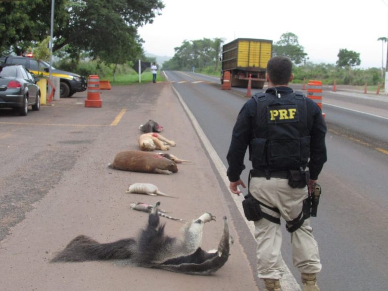 Blitz sobre atropelamentos de animais silvestres ocorreu em Barra do Garças (MT). Ideia do projeto é mostrar importância de se manter atento nas rodovias para evitar acidentes. Animais empalhados são usados em ‘blitz educativa’ para alertar sobre atropelamento em rodovias de Mato Grosso Polícia Rodoviária Federal de Mato Grosso/Assessoria Animais
