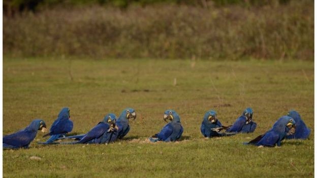 Dados do Inpe mostram que, em números absolutos, os incêndios em todo o bioma Pantanal saltaram de 1.147 entre agosto e outubro de 2018 para 6.958 no mesmo período de 2019 Araras comem cocos no chão; fogo aumenta ainda mais o risco de que algumas espécies ameaçadas de extinção desapareçam