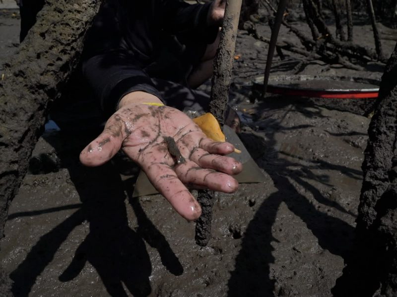 Pesquisadores coletam camarões em rios afetados por óleo para avaliar danos a espécies de mangue
