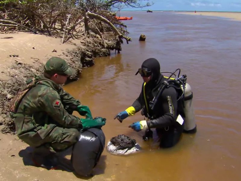 Equipes da Marinha estão atuando na área do Rio Mamucabas, em Tamandaré. Em quatro dias, eles disseram que recolheram 50 quilos de substância que estava embaixo da água. Mergulhadores coletam fragmentos de óleo em rio no Litoral Sul de Pernambuco Mergulhadores da Marinha estão realizando ações no Rio Mamucabas, em