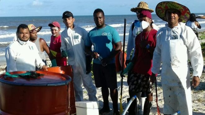 Sem recursos ou equipamentos públicos, iniciativa conta com a ajuda de centenas de voluntários e materiais usados para pesca para retirar o material de praias e do mar. Marinha diz que não há vestígios de óleo na região, que abriga maior biodiversidade marinha do Atlântico Sul. Sem recursos ou equipamentos