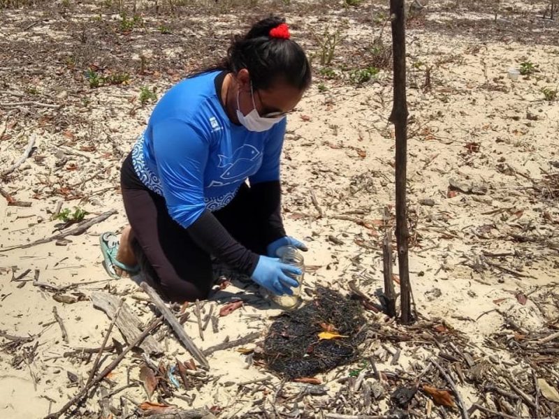 Manchas foram encontradas em capim-agulha, principal alimento de peixes-boi, na Praia da Lama em Cajueiro da Praia. Projeto ambiental monitora região para tentar localizar animais. Material coletado com óleo será encaminhado à Capitania dos Portos Pesca Solidária da Comissão Ilha Ativa Biólogos do projeto Pesca Solidária encontraram manchas de óleo