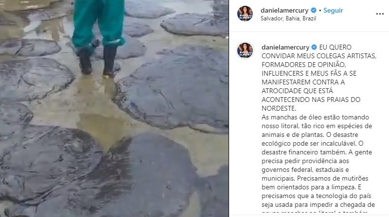 Daniela Mercury, Luiz Caldas e Banda Olodum lamentaram a presença das manchas e pediram soluções par órgãos públicos. Artistas baianos se mobilizam contra o desastre ambiental que atinge o litoral baiano Artistas baianos, como Daniela Mercury, Luiz Caldas e integrantes do grupo Olodum, gravaram vídeos e usaram as redes sociais