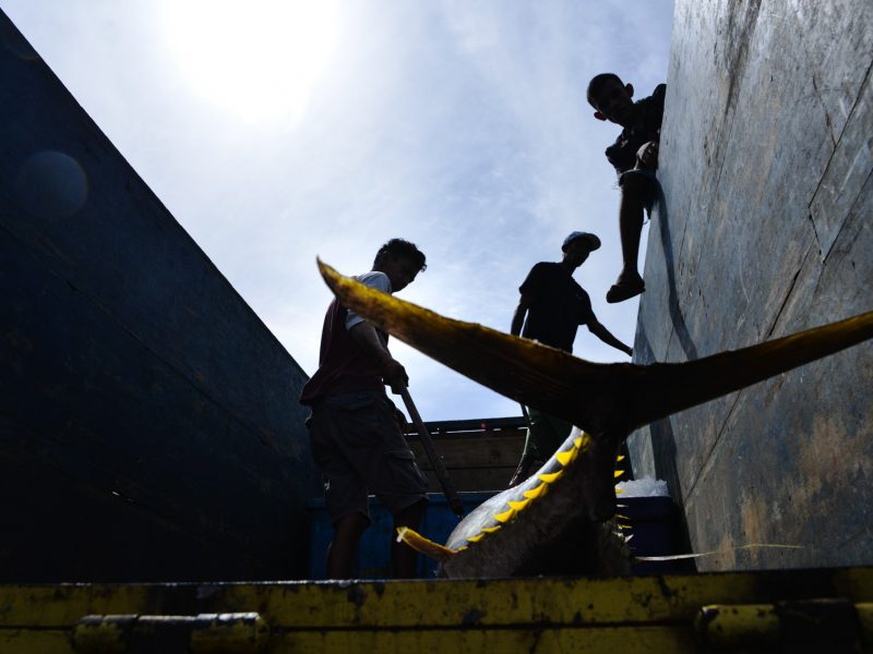 Trabalhadores carregam atum albacora em um caminhão em um porto de pesca em Banda Aceh, na Indonésia Chaideer Mahyuddin/AFP/Arquivo Estudo recente, publicado pela revista Fisheries Research, o primeiro a estimar o volume de atum retirado dos oceanos, revelou que cerca de seis milhões de toneladas deste peixe são capturadas anualmente.