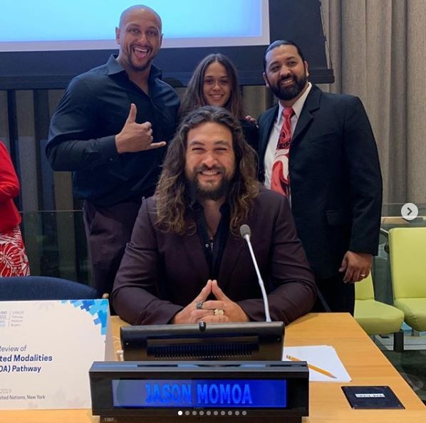 Jason Momoa participou de reunião na ONU com representantes de países insulares. Segundo instituto, aquecimento global vai elevar o nível do mar em até 1 metro em 80 anos. Ator Jason Momoa participa de reunião na ONU sobre aumento no nível do mar causado pelo aquecimento global Reprodução/Instagram O ator