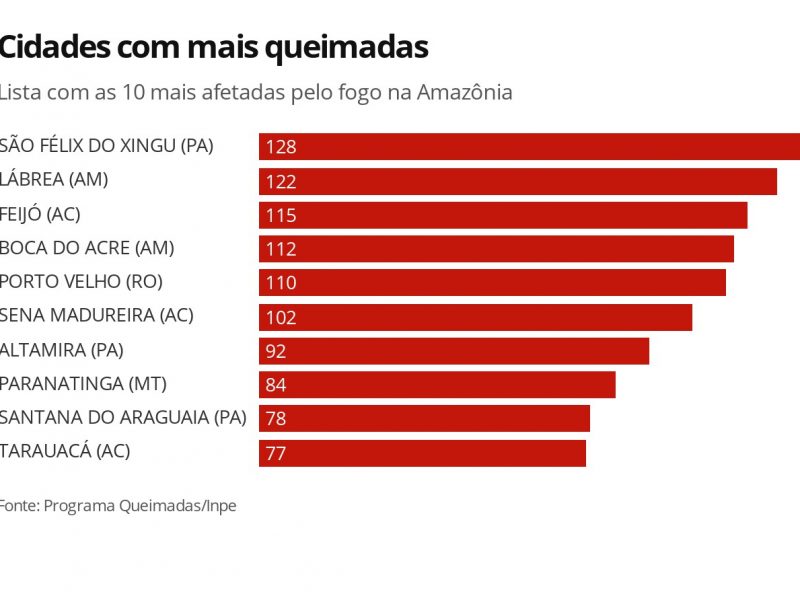 Cidade do Pará acumulou 128 focos na semana, seguida por Lábreas (AM) e Feijó (AC), conforme o Programa Queimadas, do Inpe. O Pará tem 3 cidades na lista das 10 com mais queimadas entre domingo (1º) e quinta-feira (5). O município de São Félix do Xingu, no Pará, foi a