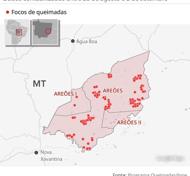 Na quarta (28), órgãos foram a campo buscar responsáveis pelos focos. No sábado (31), três dias depois, o Inpe detectou o maior número de queimadas no ano no local: 46 focos. Areões, território indígena em Mato Grosso, registrou 46 focos de queimadas no sábado (31), segundo o Instituto Nacional de