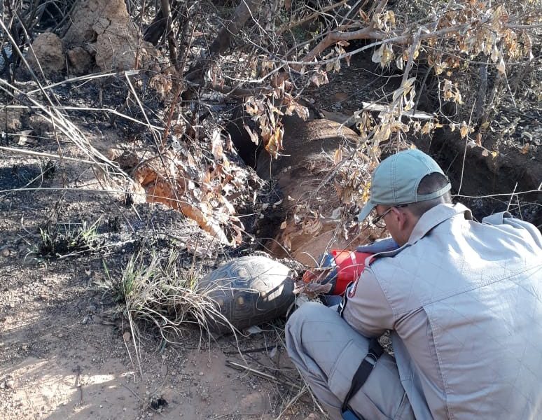 Imagens mostram momento em que animal recebia água de militar que ajudou no socorro. Equipes combatem foco entre Palmas e o distrito de Taquaruçu. Jabuti foi resgatado de queimada pelo Corpo de Bombeiros Divulgação/Corpo de Bombeiros O Corpo de Bombeiros resgatou neste sábado (31) um jabuti de uma queimada às