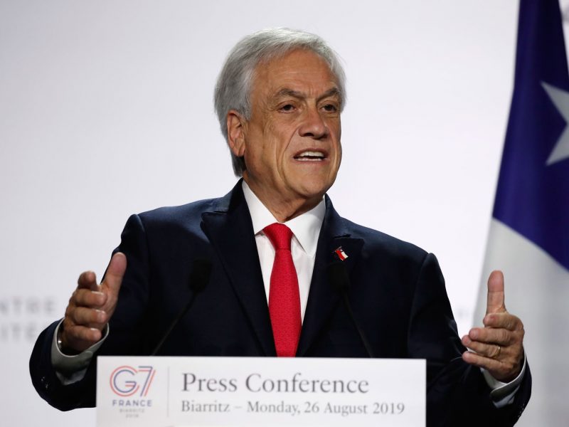 Envio será financiado pelos países membros do G-7. Presidente Sebástian Piñera, que assumiu coordenação da ajuda do grupo para combater incêndios na Amazônia, diz que já manteve contato com governos de Brasil, Paraguai, Peru, Colômbia e Bolívia. O presidente do Chile, Sebástian Piñera, durante coletiva de imprensa em Biarritz, na