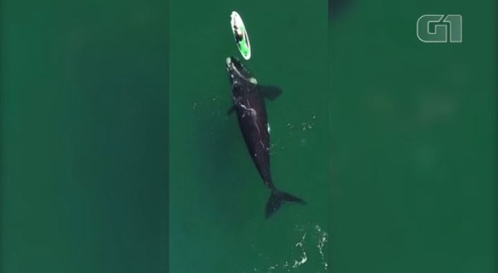 Encontro ocorreu em Puerto Madryn, cidade localizada na costa norte da Patagônia VÍDEO: Drone registra baleia nadando em volta de caiaque, na Argentina Uma baleia-franca-austral se aproximou de um caiaque e passou a nadar ao lado do remador na Argentina. A cena foi flagrada por um fotógrafo com a ajuda