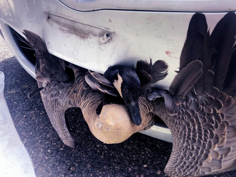 Ave foi socorrida, quebrou a bacia, mas deve se recuperar. Ganso fica preso em grade de carro nos EUA Esther Lotz via AP Um ganso ficou preso em um carro de um entregador de pizza em Burlington, no estado americano de Vermont. Ryan Harrington, o motorista, disse à TV local