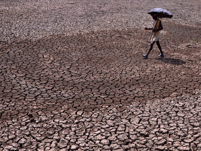 Para Administração Nacional Oceânica e Atmosférica dos Estados Unidos, 2019 estará entre os cinco anos mais quentes registrados no mundo desde o estabelecimento de registros meteorológicos. Um homem segura um guarda-chuva ao passar por uma lagoa que secou nos arredores de Bhubaneswar, na Índia. Muitas cidades indianas enfrentam escassez de