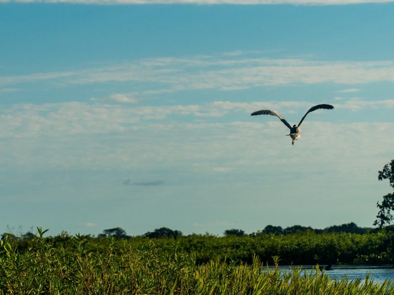 Em fevereiro, Câmara dos Deputados desarquivou projeto que pode liberar a caça de animais silvestres. Já no setor hídrico, Agência Nacional de Águas tenta frear licenciamento de obras que podem barrar o ciclo reprodutivo dos peixes do bioma. Ave voa sobre os aguapés do Rio Bracinho, no Pantanal matogrossense, em