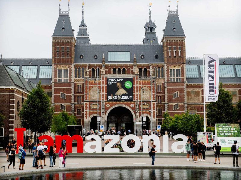 Painel que formava ‘Iamesterdam’ foi retirado em 2018 após 14 anos de sucesso. Letreiro foi recolocado com a mensagem alterada para ‘Iamazonia’ pelo Greenpeace. As letras gigantes em frente ao Museu Nacional de História e Arte dos Países Baixos, o Rijksmuseum, em Amsterdã, na Holanda, foram alteradas para exibir a