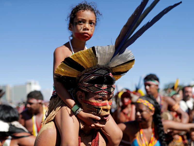 Indígenas participam de um protesto em Brasília para defender a terra indígena e os direitos culturais que, segundo eles, estão ameaçados pelo governo de direita do presidente Jair Bolsonaro Nacho Doce/Reuters No mês passado, os defensores dos indígenas, as pessoas que respeitam os povos tradicionais, comemoraram a revoada legislativa que