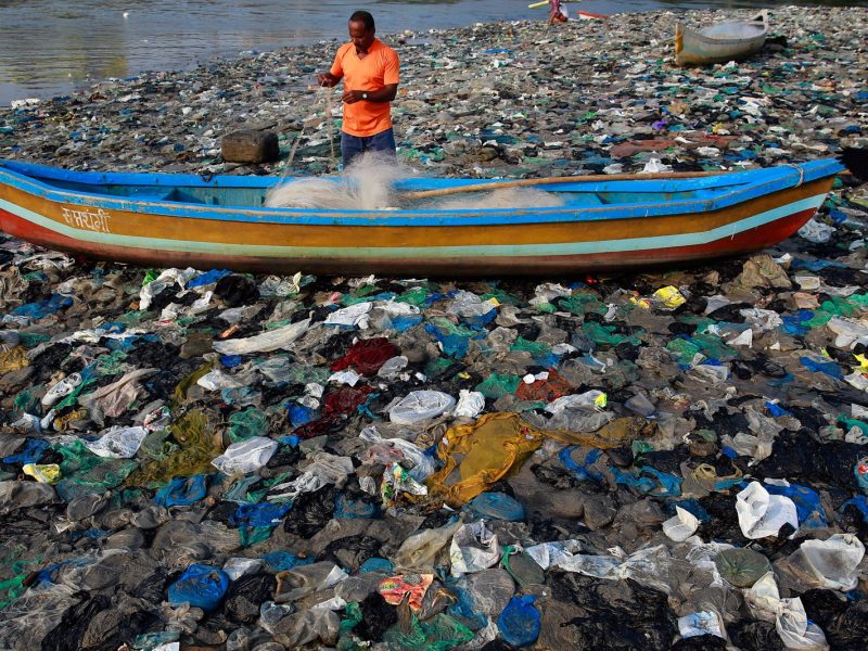 Países se comprometem a “reduzir significativamente o lixo marinho” produzido em seus territórios. No entanto, como é frequente no caso da Asean, nenhuma medida específica foi definida para alcançar objetivo. Um pescador prepara a sua rede nas margens do Mar Arábico, cheio de sacos de plástico, em Mumbai, na Índia.