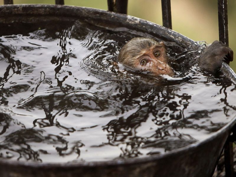 Brigas entre macacos e tigres são algumas das mudanças. Temperaturas ultrapassaram os 50°C. Macaco entra em balde de água para se refrescar devido ao forte calor do verão em Jammu, na Índia, em foto de 2016. AP Brigas entre macacos e tigres são algumas das mudanças de comportamentos observadas pela