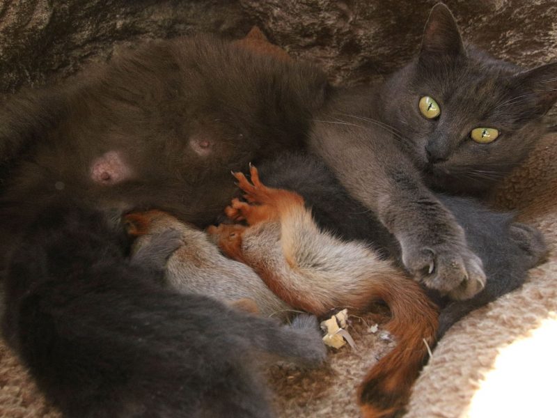 Gata ‘adota’ filhotes de esquilo na Crimeia
