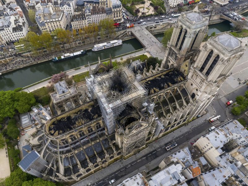 Colmeias na catedral abrigavam 200 mil abelhas. Apicultor diz que pessoas de diversos países telefonaram querendo saber se insetos tinham conseguido se salvar; ele espera revê-los na próxima semana. Imagem aérea mostra a extensão dos danos ao telhado da Notre-Dame após o incêndio que destruiu parcialmente a catedral em Paris