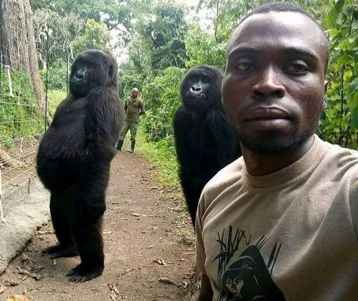 Animais de santuário na República Democrática do Congo imitam cuidadores. Dois gorilas posam com o guarda que os resgatou quando eram bebês Mathieu Shamavi / Reprodução Facebook Dois gorilas de um santuário para esses animais na República Democrática do Congo aprenderam a imitar seus cuidadores e passaram a posar para