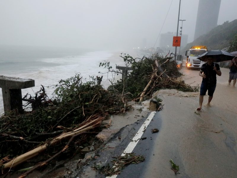 Pessoas passam ao lado de trecho destruído da ciclovia Tim Maia, no Rio de Janeiro, após fortes chuvas REUTERS/Sergio Moraes “É uma chuva completamente atípica”, disse o prefeito Marcelo Crivella nesta segunda (8) à noite no auge dos estragos causados por um dilúvio que colapsou a cidade, sem se dar